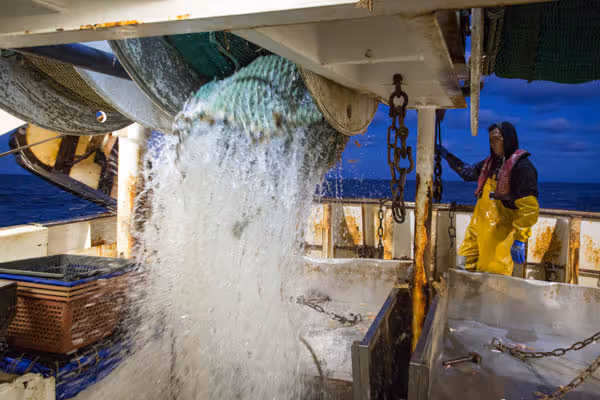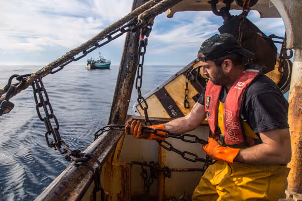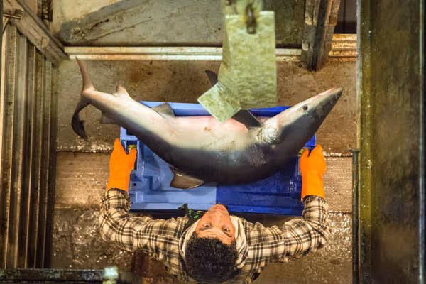 A la poupe du navire, José, Olivier et Nizer surveillent le chalut. Après trois heures passées sur les fonds sablonneux, le gigantesque filet libère ses prises. Langoustines, lottes, merlus, tourteaux…tombent dans l’un des deux bacs de tri. Ils rejettent à la mer les prises non désirées ou trop petites comme ce requin à peau bleue encore bien vivant.