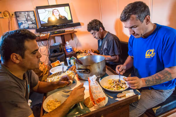 Un travail aussi physique nécessite de reprendre des forces. Entre deux traits de chalut, les marins tentent de se reposer dans leurs couchettes au-dessus de la salle des machines. Chaleur, bruit et odeur du moteur diesel sont bien présents mais ils n’y prêtent plus attention, ils dorment sur commande, 2 heures au maximum.
